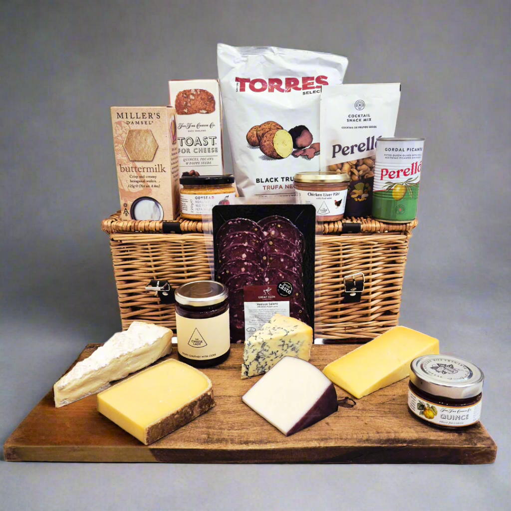 Featuring a classic cheese selection of Brie de Meaux, Muria al Vino, Comté Reserve, Isle of Mull Cheddar, and Stilton Colston Bassett, perfectly paired with Buttermilk Crackers and The Cheese Lady Fruity Chutney.
